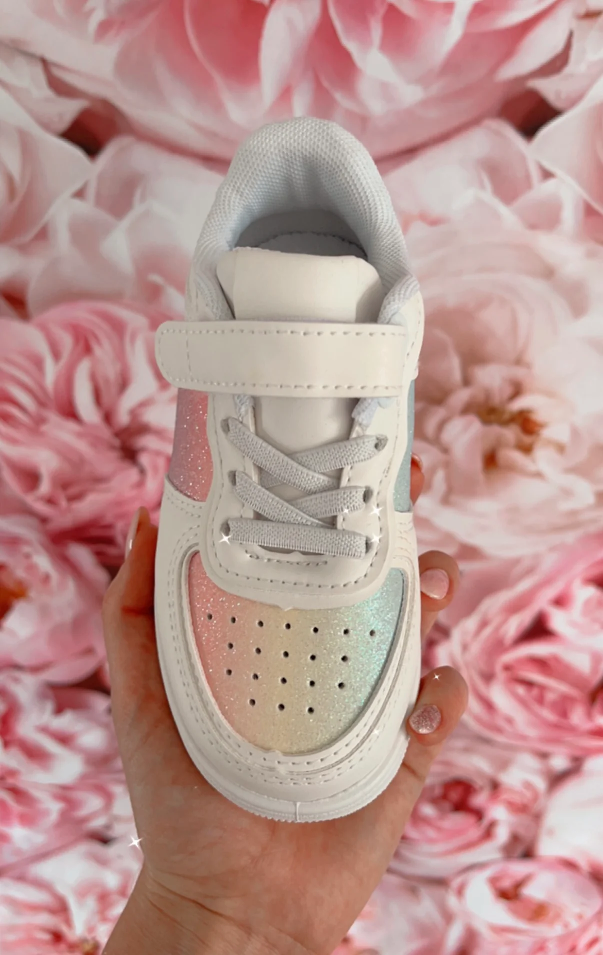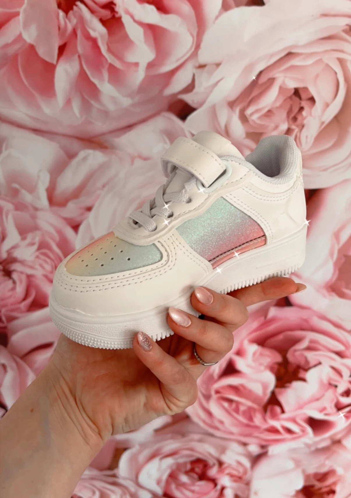 • Baskets semelle épaisse • De couleur blanche, couleurs pailletées • Fermeture à scratch