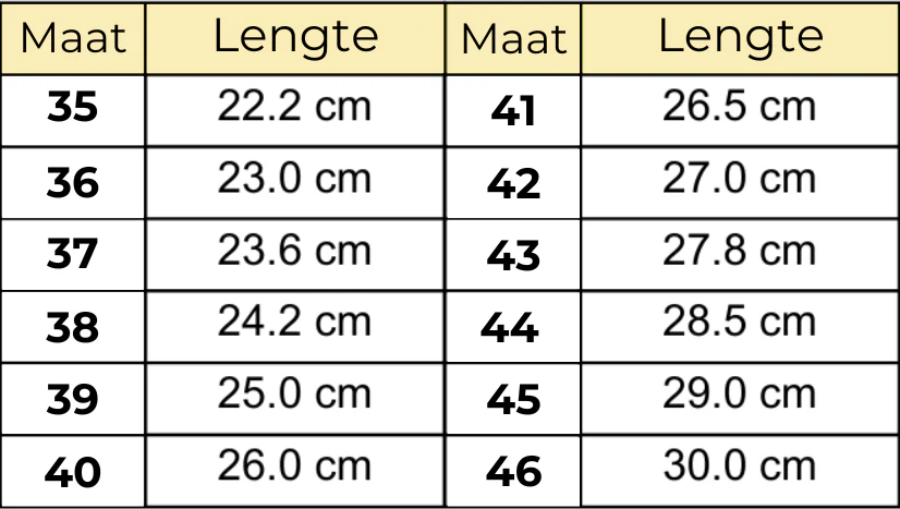 Conseil : Nos chaussures Barefoot sont légèrement plus petites que la normale, il est donc fortement recommandé de commander une taille au-dessus de la normale. Si vous êtes entre deux pointures, nous vous conseillons de prendre une pointure et demie de plus.