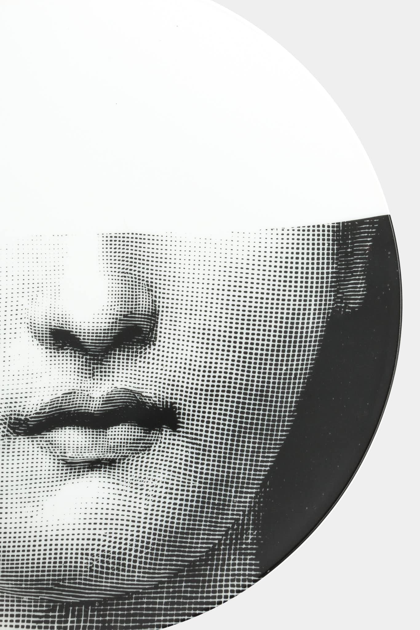 Assiette murale Fornasetti noire et blanche en céramique, décorée d’une partie du visage de la muse lyrique Lina Cavalieri. Fabriquée à la main en Italie avec des techniques exclusives.