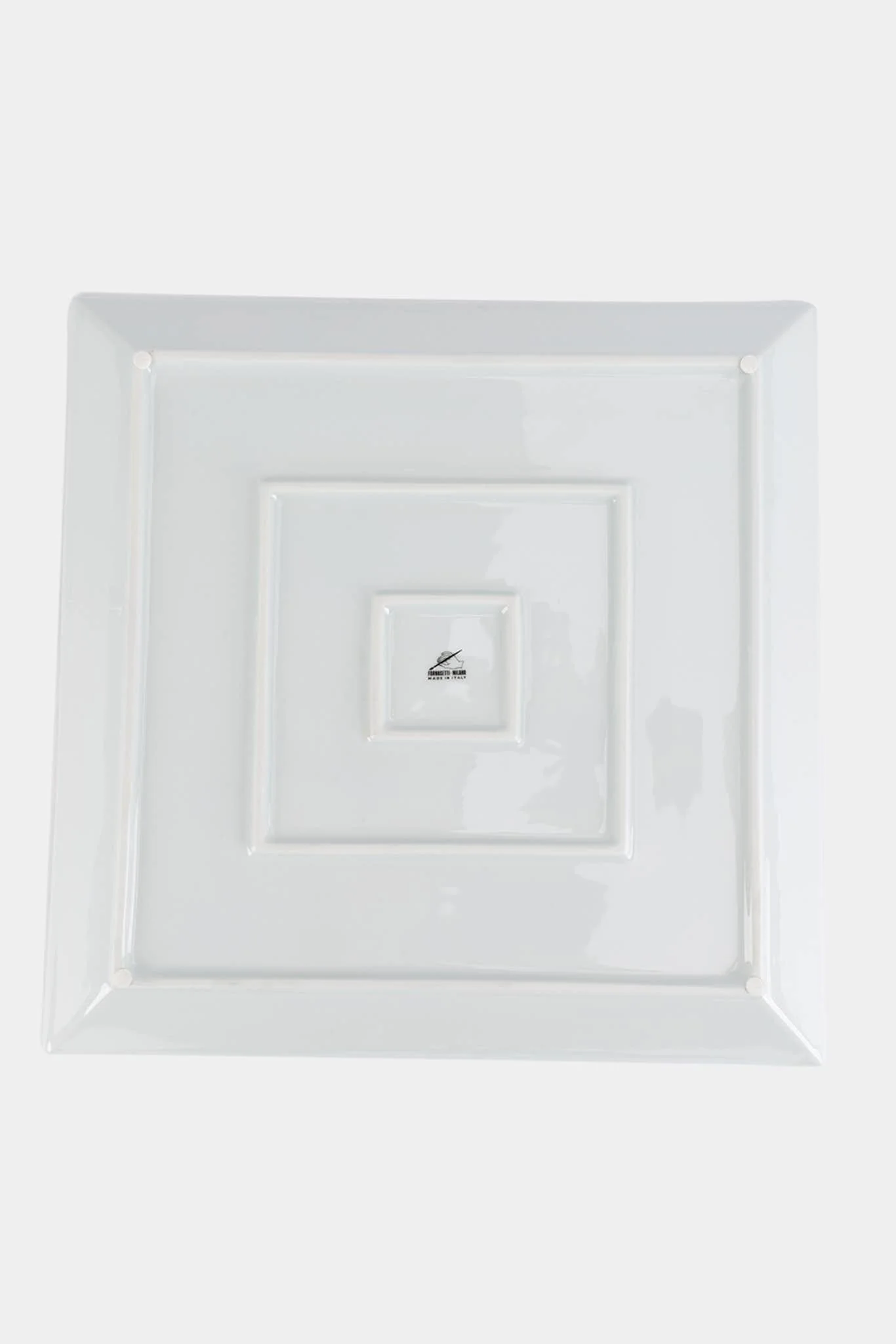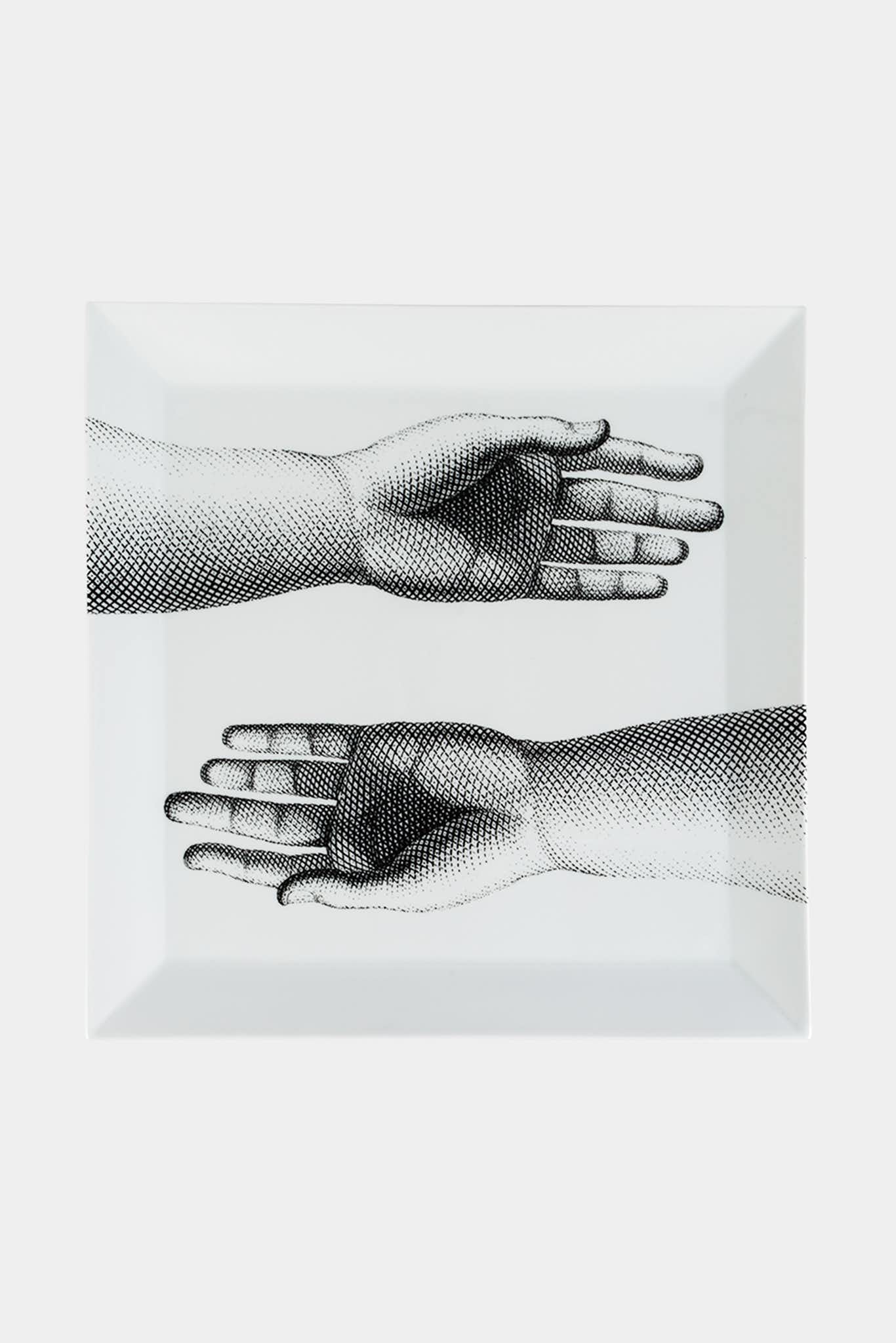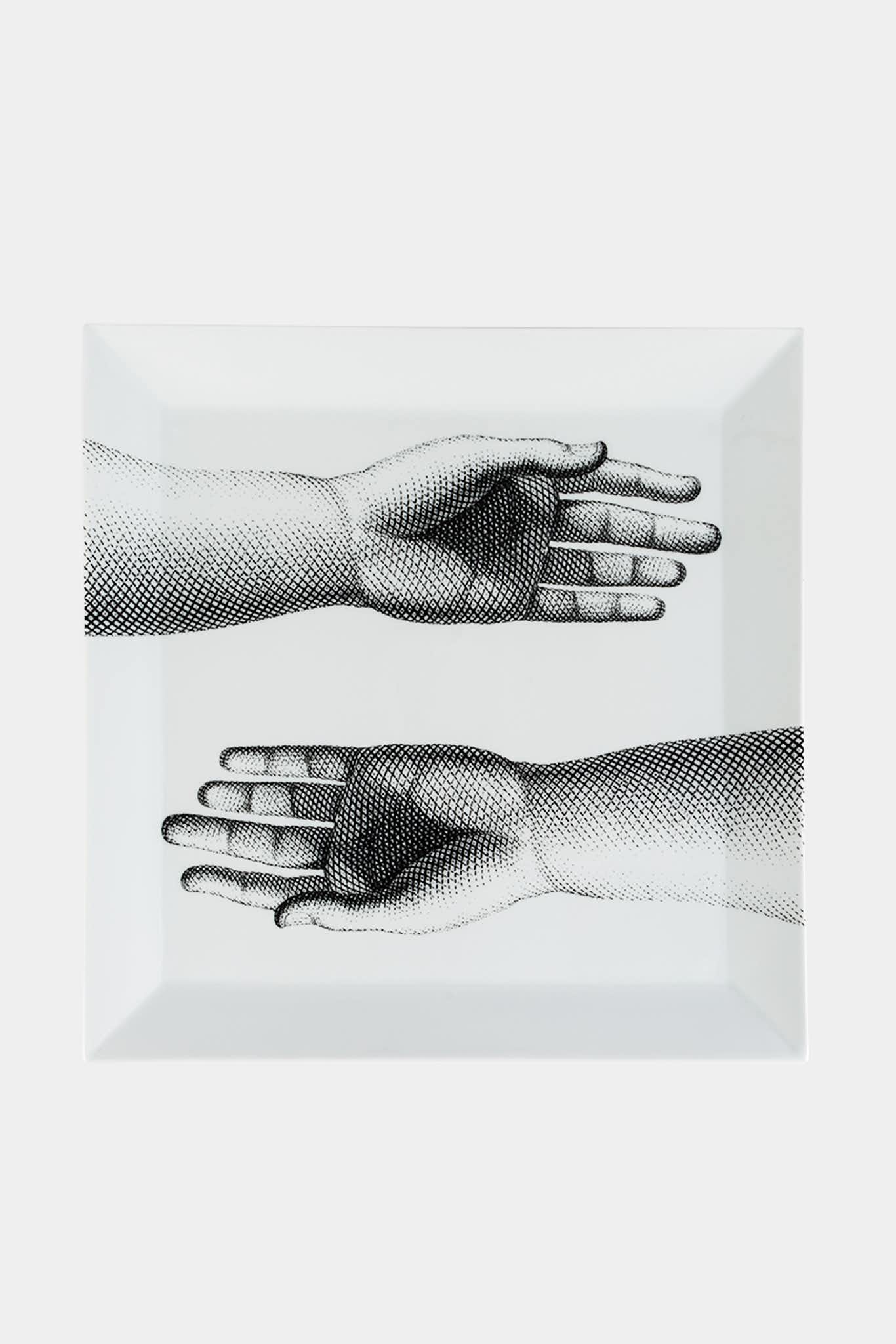 Plateau carré Fornasetti noir et blanc en céramique, décoré de mains. Fabriqué à la main en Italie avec des techniques exclusives.
