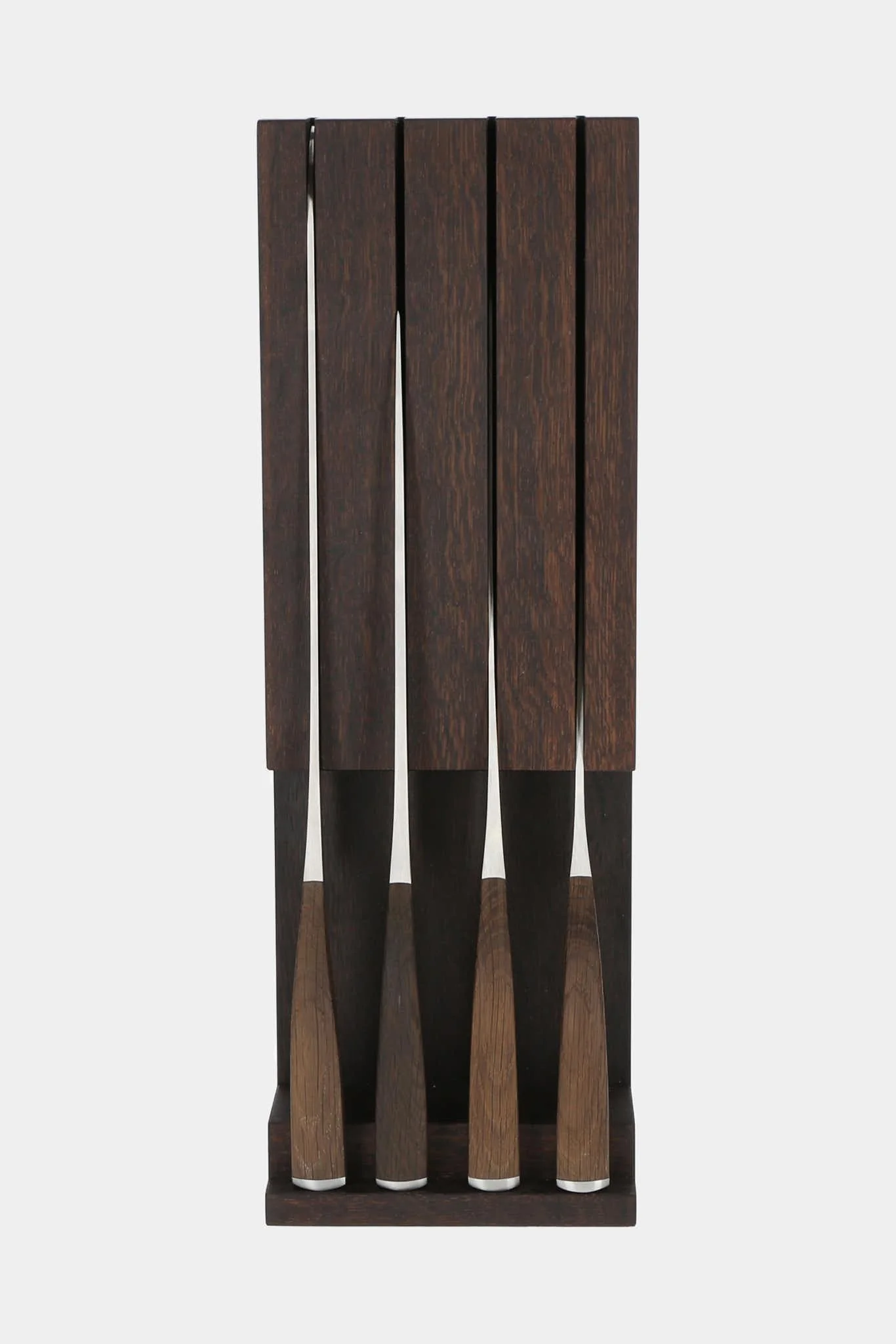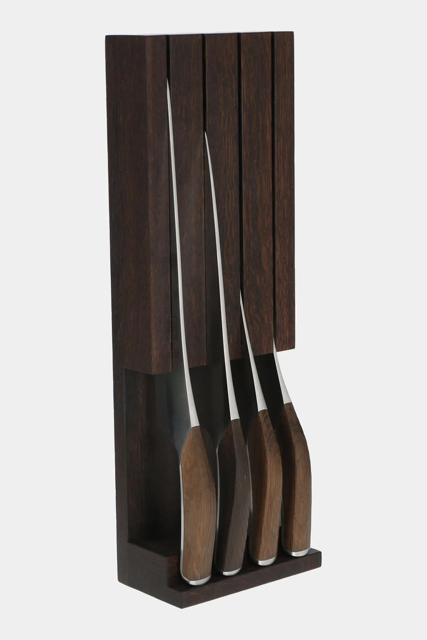 Porte-couteaux « Synchros » en bois de chêne fumé pouvant contenir 4 couteaux. Cet article peut être utilisé à la fois debout et couché. Les couteaux sont maintenus par un aimant sur le manche afin qu’ils restent en position debout.