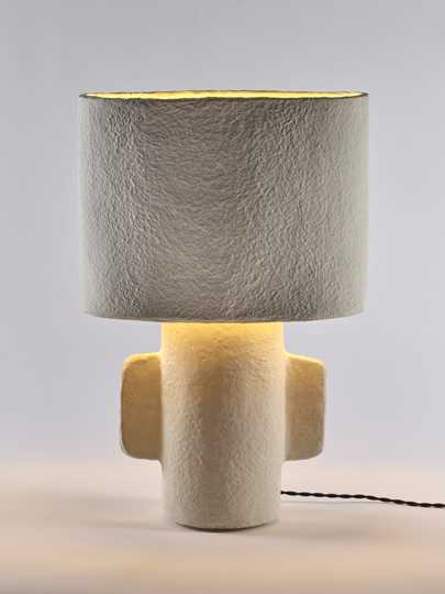 Lampe de table « Earth » en papier mâché. 240 V. Longs et étroits, ou au contraire petits et arrondis, avec de grandes ou de petites oreilles, certaines accidentellement plus basses que d’autres : aucun article de la collection papier mâché de Marie Michielssen n’est identique. La structure apparente du matériau, volontairement grossière, les couleurs primitives gris […]